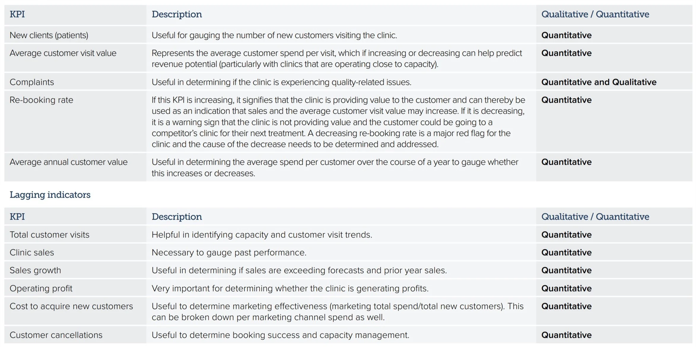Lagging indicators are necessary because they provide the clinic with achieved results. For example, ‘operational profitability’ is a lagging indicator because it only provides data based on historical performance. Therefore, operational performance as an indicator is not always helpful in determining future performance because one period of profit generation cannot guarantee the next period will remain profitable.