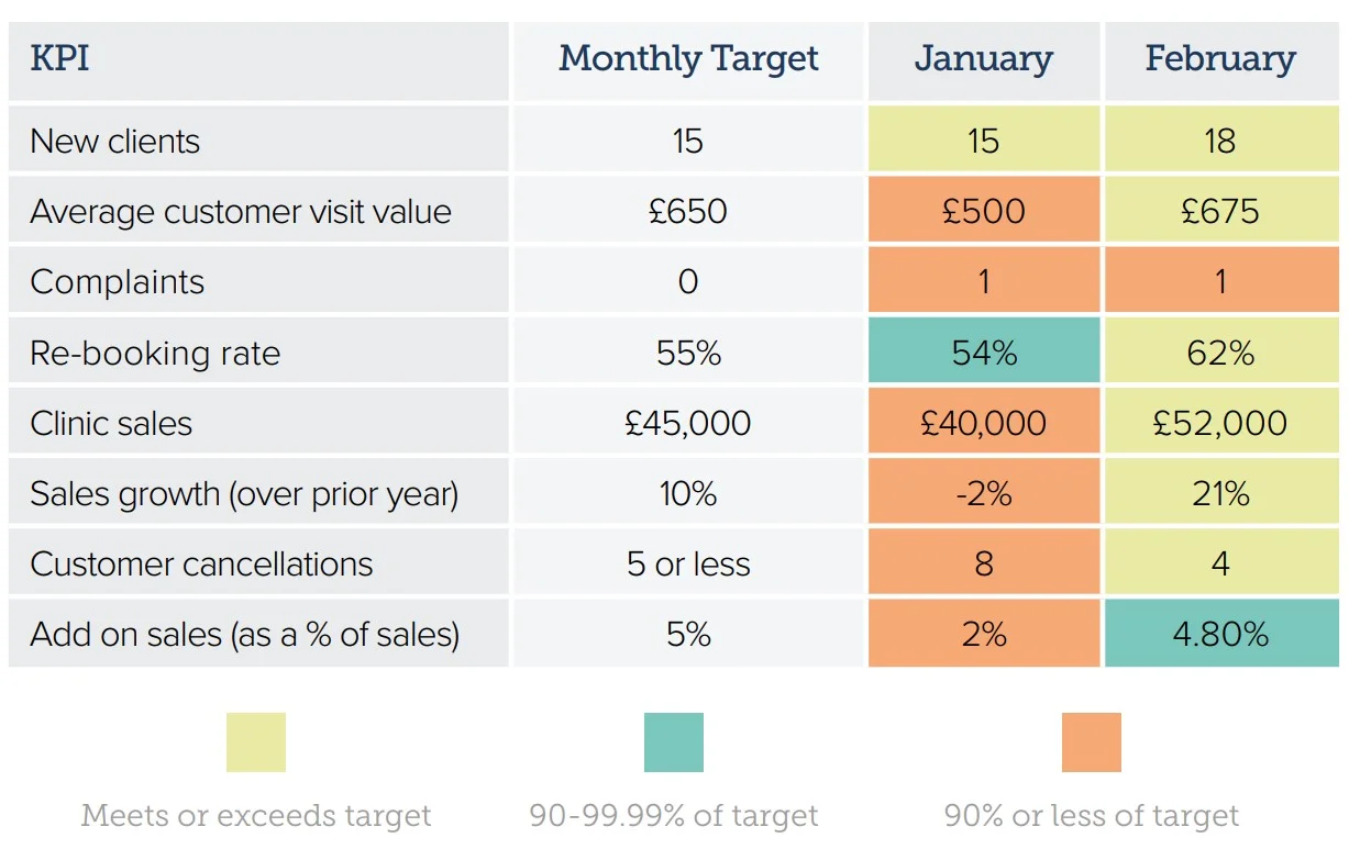 It is necessary to define the objective of the clinic, functional areas or initiatives. A clinic may choose, for example, that its objective is to grow sales. This chosen objective becomes the guiding principle behind all the KPIs of the clinic, functional areas or initiatives, which may include KPIs such as: year-to-date sales growth, re-booking rates and growth in average spend per customer etc. It is important to note, however, that the objective of the clinic needs to match the stated or implied strategy of the clinic in order to ensure it is moving closer to its goals.